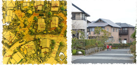 開発する際に、敷地である松林に街区を想定し,住宅の建つ位置,日照等を考慮しながら残せる限りのマツに印をつけ,小型ブルドーザーで林を縫うように造成を行ないました。宅地間のマツも残すことができるように,ひな壇状の分譲地にするのではなく,現況地形を生かした造成を行っており,宅地規模は平均340㎡(103坪)となっています。